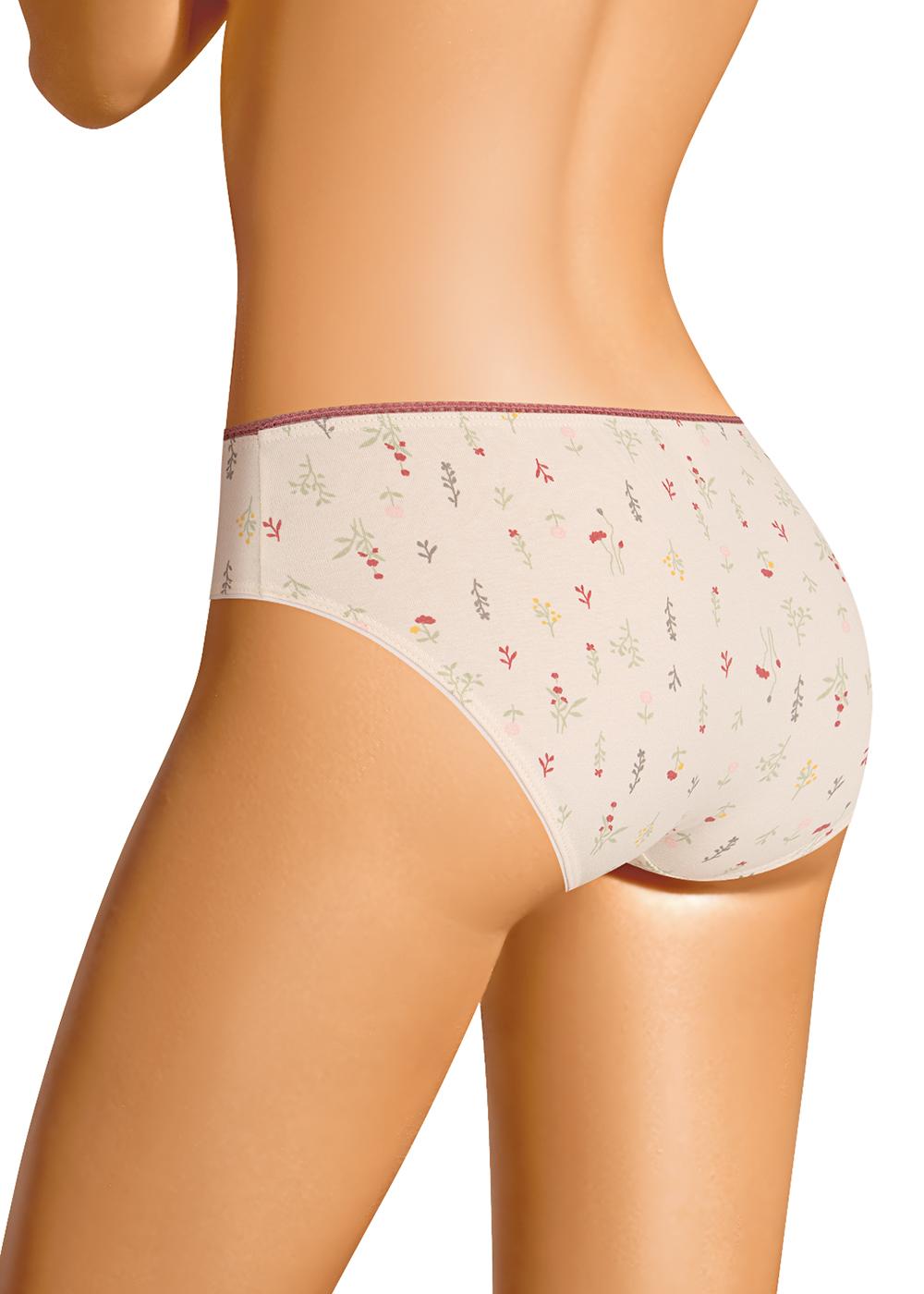 Трусы бикини женские из эластичного хлопкового полотна. Обработка краев по талии - ажурная резинка, по ноге - полуокантовка.